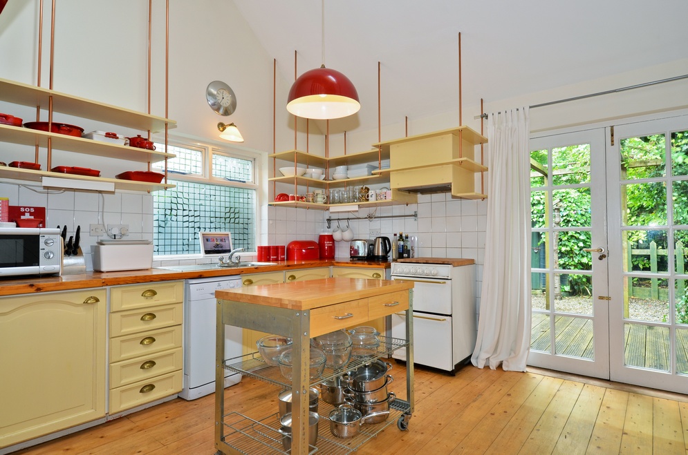 The simple timber floor running through the ground floor and a timber kitchen was already in situ when Orla moved in, so she really had no say in that but she has enhanced the simple semi rustic and semi contemporary look and feel to the house. The kitchen units are very unusual with open shelving above the cupboards with a series of copper piping going through each set of shelves – a really unique touch to the kitchen. A movable island was added which complements the kitchen and can be wheeled out of the way when it is needed. A rough timber table sits to the right of the kitchen and ultra modern white chairs sit neatly at the table. Orla chose red accessories to blend with the copper piping and also added large red dome shades to cover the drop lighting in the kitchen area. A large metal beam is painted in red and denotes where the old house ended and the extension started.